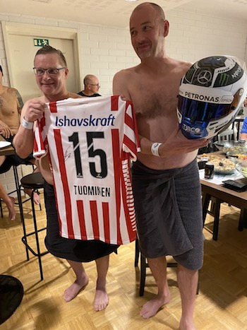 Tromsö pelipaita nimmarilla, ja golffari Matilda Castrenin nimmaroidut aurinkolippa ja golfpallo (Golfjutskat päätettiin kuitenkin säästää golfkisaan. Jygä hoitaa)Loppupelissä Alfauros VG:tä onnisti Alfa-lippiksen kanssa